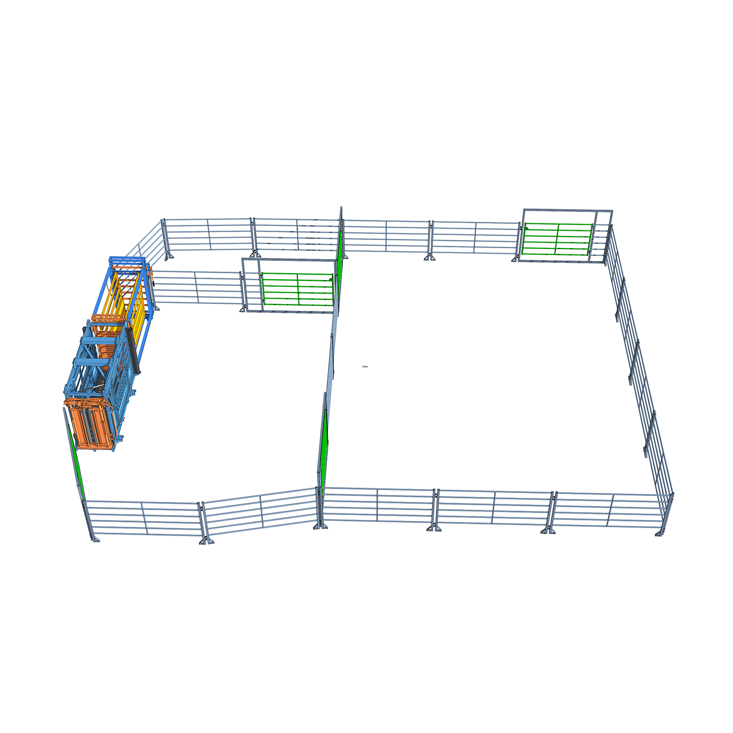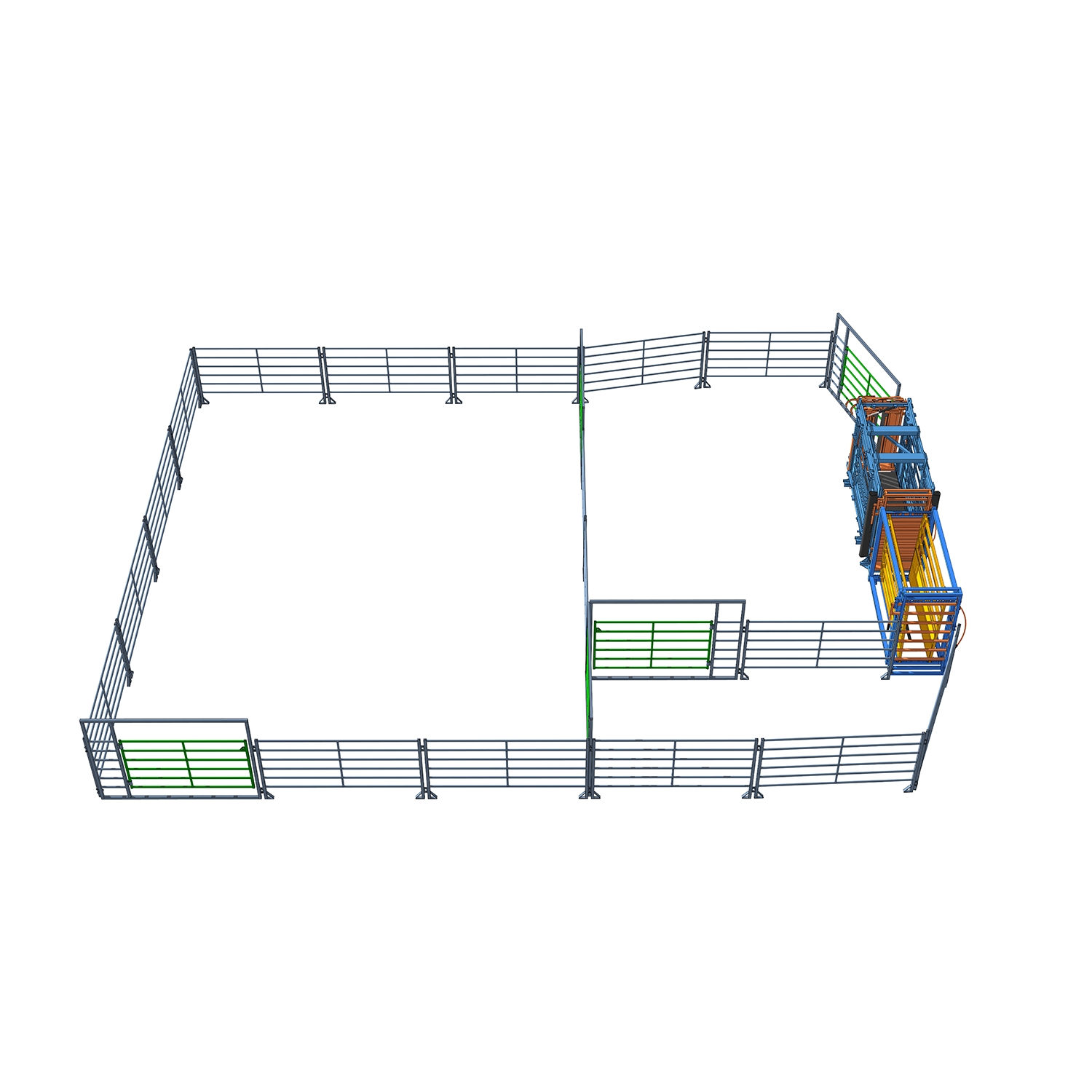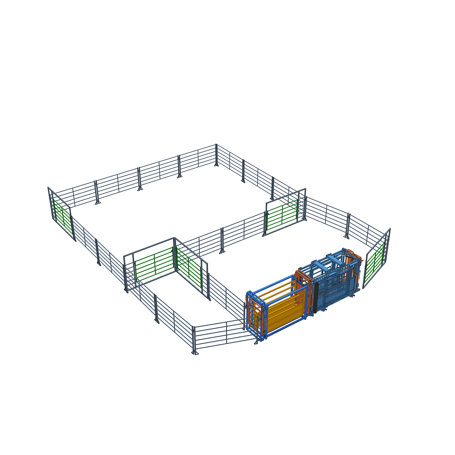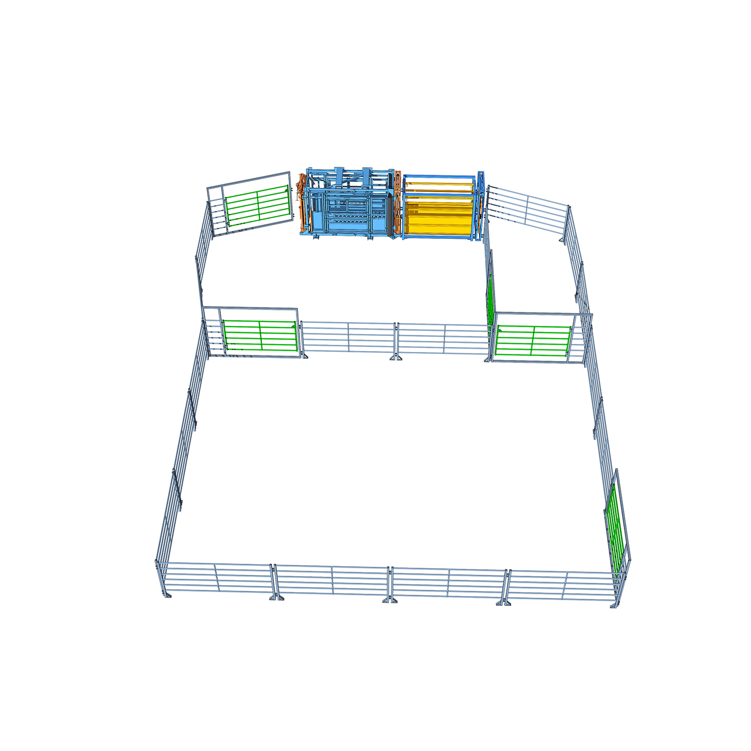 Компактная конфигурация для ежедневных операций: вакцинация, чипирование, взвешивание, отбор и сортировка. Входные ворота можно ставить в любой точке внешней границы, на выходе предусмотрена сортировка в два направления. Вместимость считается по площади: ≈2 м² на голову (ориентир для коровы ~450 кг). Комфортно 55, максимум до 80 голов — зависит от породы, массы и темперамента.