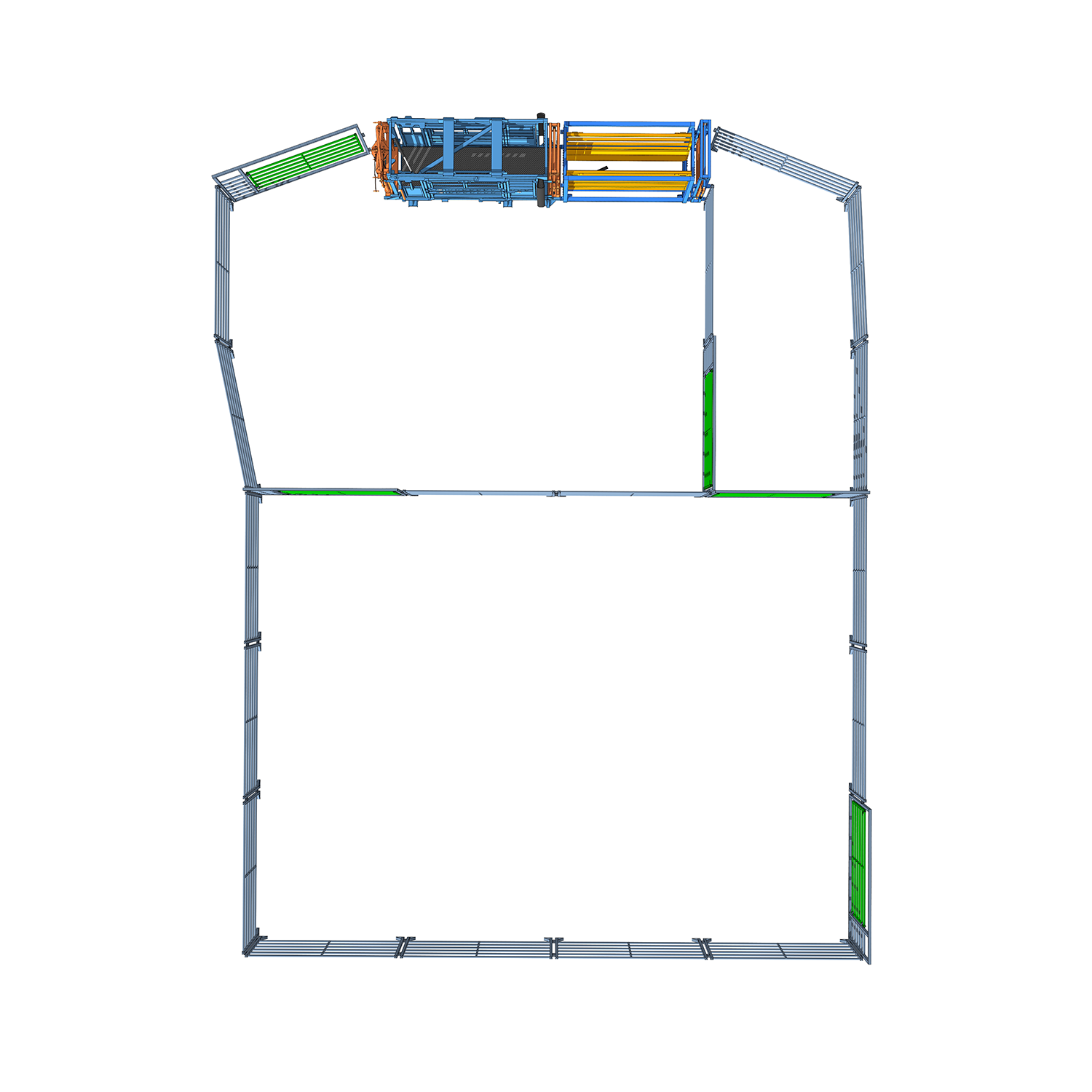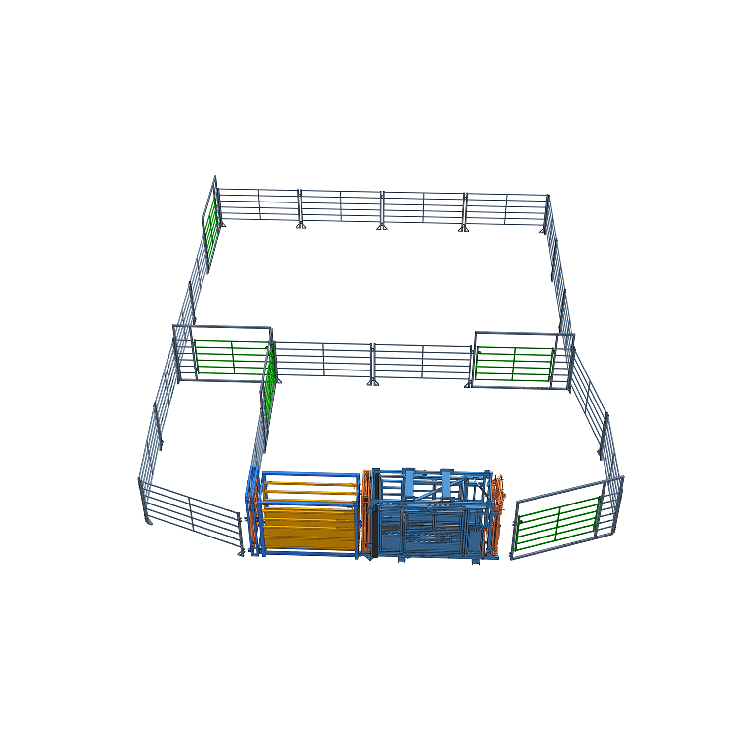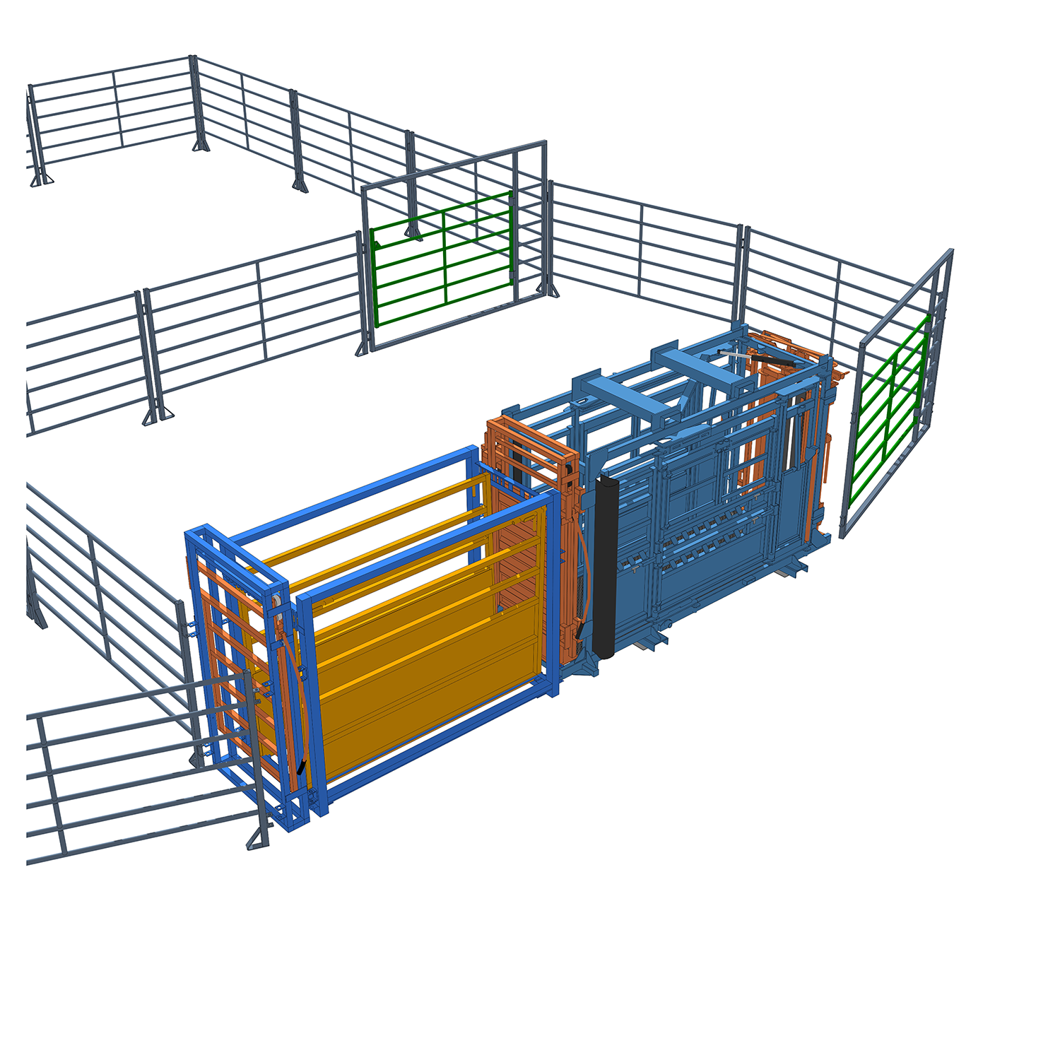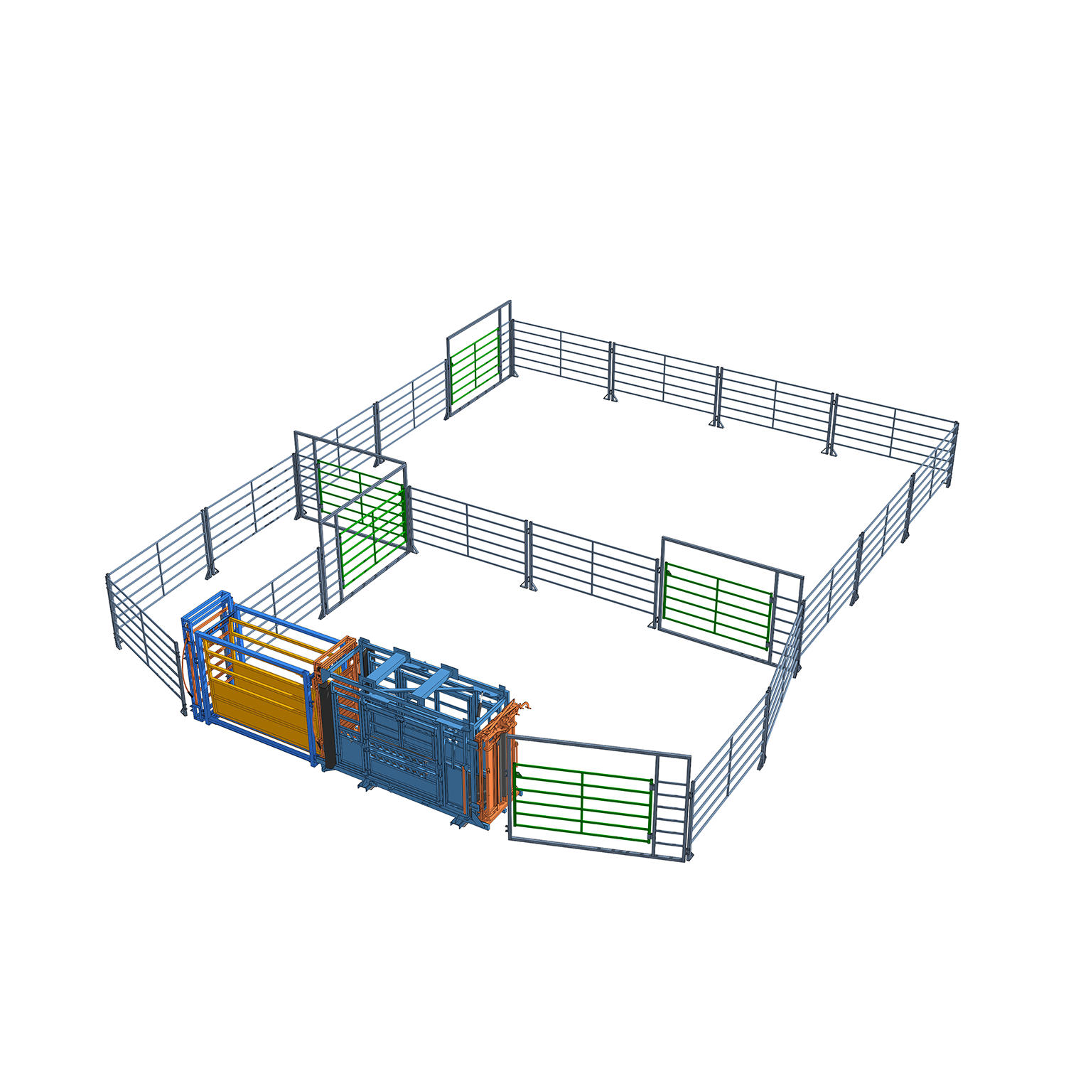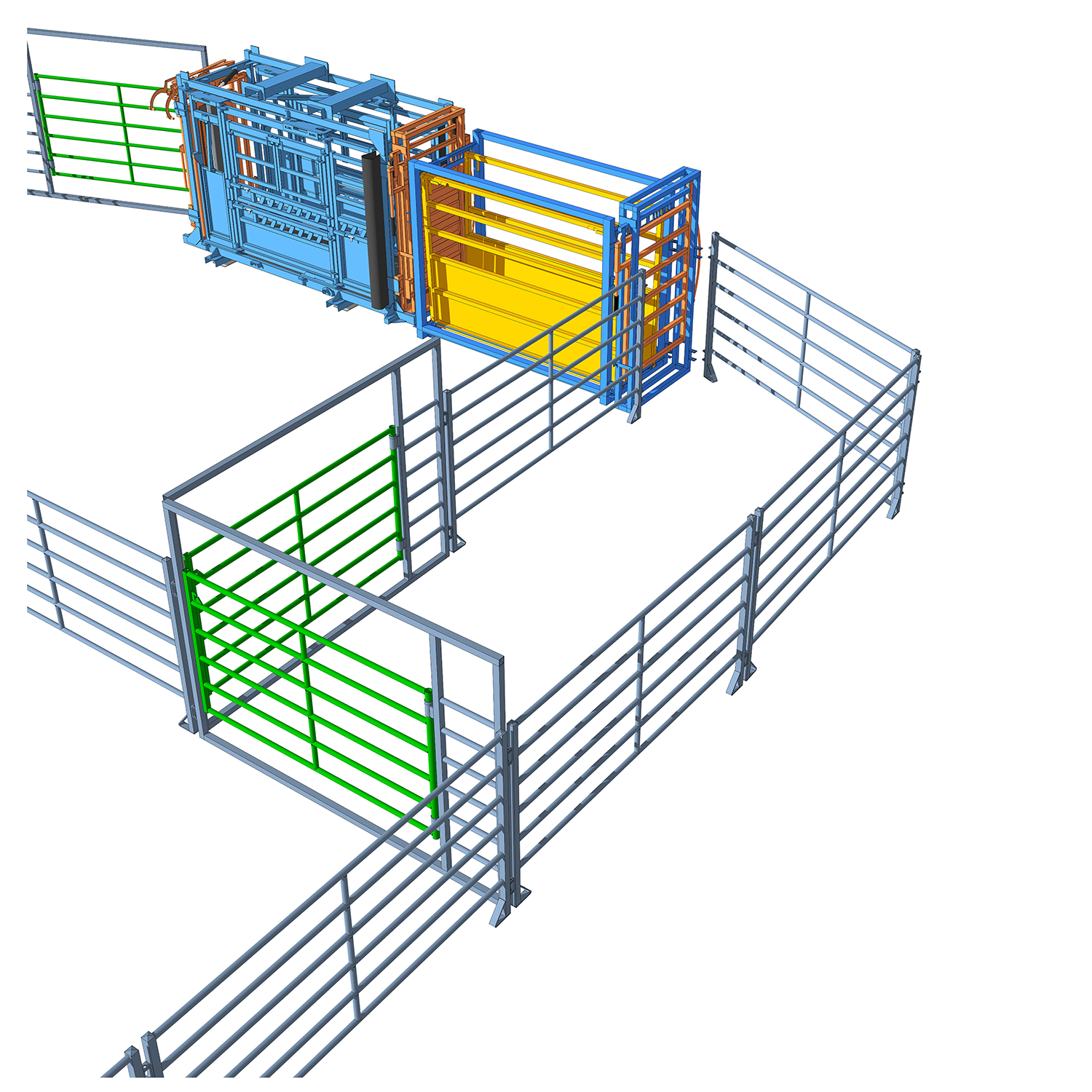 Компактная конфигурация для ежедневных операций: вакцинация, чипирование, взвешивание, отбор и сортировка. Входные ворота можно ставить в любой точке внешней границы, на выходе предусмотрена сортировка в два направления. Вместимость считается по площади: ≈2 м² на голову (ориентир для коровы ~450 кг). Комфортно 55, максимум до 80 голов — зависит от породы, массы и темперамента.